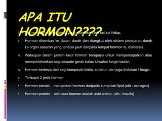 Hormon daripada perkataan Yunani Kuno ὁρμῶν yang menggerakkan merujuk kepeda sebatian kimia yang bertindak sebagai penyampai maklumatisyarat antara sel-sel badan. Contoh Ayat Bagi Hormon. Jakarta - Tubuh manusia terdiri dari berbagai macam hormon yang memiliki fungsi masing-masing.